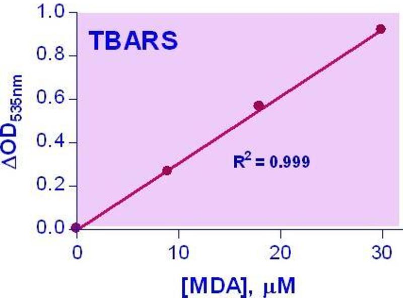 Oxidative attack of essential cell components by reactive oxygen species has been associated with several human diseases, such as atherosclerosis, cardiovascular diseases, diabetes, liver disorders, and inflammatory rheumatic diseases. Thiobarbituric Acid Reactive Substances (TBARS) are low-molecular-weight end products (mainly malondialdehyde, MDA) that are formed during the decomposition of lipid peroxidation products. Increased levels of TBARS have been demonstrated in these diseases. Simple, direct and accurate assays for TBARS find wide applications in research and drug discovery. This TBARS assay is based on the reaction of TBARS with thiobarbituric acid (TBA) to form a pink colored product. The color intensity at 535nm or fluorescence intensity at (ex/em = 560nm/585nm) is directly proportional to TBARS concentration in the sample.
