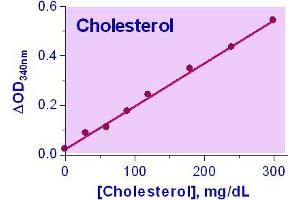 Cholesterol is a sterol and lipid present in the cell membranes, and is transported in the bloodstream of all animals. It is used to form cell membranes and hormones, and plays important roles in cell signaling processes. Elevated levels (hypercholesterolemia) have been associated with cardiovascular diseases such as atherosclerosis, whereas, low levels (hypocholesterolemia) may be linked to depression, cancer and cerebral hemorrhage. Simple, direct and automation-ready procedures for measuring cholesterol are very desirable. This Cholesterol Assay is based on cholesterol esterase hydrolysis of cholesterol esters to form free cholesterol and cholesterol dehydrogenase catalyzed conversion of cholesterol to cholest-4-ene- 3-one, in which NAD is reduced to NADH. The optical density of the formed NADH at 340 nm is directly proportionate to the cholesterol concentration in the sample.