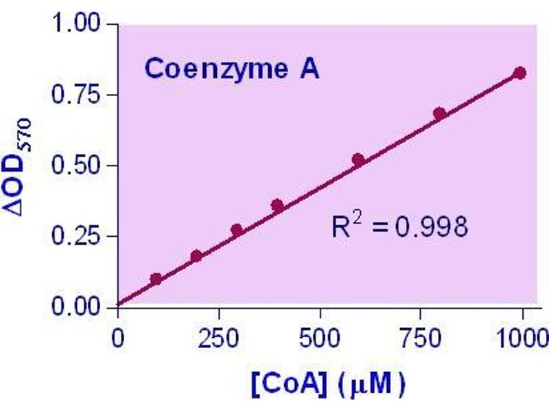 Coenzyme A (CoA) is involved in many important biological activities including the synthesis and oxidation of fatty acids, pyruvate oxidation in the citric acid cycle and many others. One of CoA's most crucial roles is the carrying and transferring of acyl groups. This method provides a simple, two-step and high-throughput assay for measuring CoA. In this assay, the first step enzymatically converts CoA to acyl-CoA and the second step oxidizes the acyl-CoA producing an enoyl-CoA and H2O2. The resulting H2O2 reacts with a specific dye to form a pink colored product. The optical density at 570nm or fluorescence intensity (530/585 nm) is directly proportional to the CoA concentration in the sample.