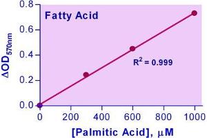 Sensitive. Use 10 µL samples. Linear detection range: colorimetric assay 7 - 1000 µM, fluorimetric assay 7 - 100 µM fatty acid.