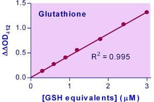 Glutathione, a tripeptide of glycine, glutamic acid and cysteine, is one of the key antioxidants involved in protecting cells from damages by reactive oxygen species. Glutathione (GSH) reduces disulfide bonds in cytoplasmic proteins to cysteines, in which it is converted to its oxidized form GSSG. This GSH/GSSG Assay Kit is designed to accurately measure total, reduced and oxidized glutathione in biological samples using an enzymatic method that utilizes Ellman's Reagent (DTNB) and glutathione reductase (GR). DTNB reacts with reduced glutathione to form a yellow product. The rate of change in the optical density, measured at 412 nm, is directly proportional to glutathione concentration in the sample. This kit can also be used to measure oxidized (GSSG) by using a specific protocol which first scavenges all GSH with 1-methyl-2-vinylpyridinium triflate.