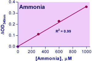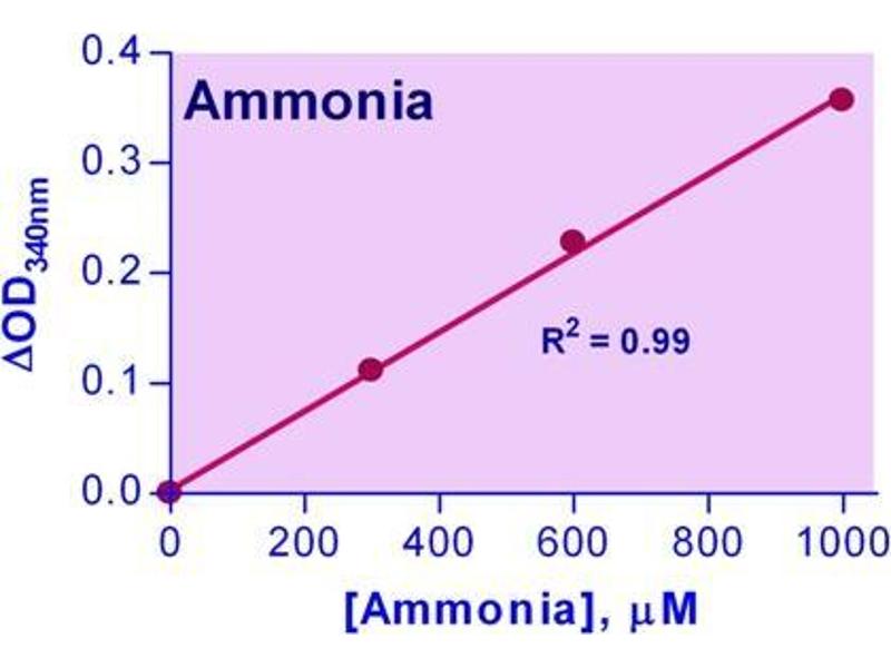 Ammonia (NH3) or its ion form ammonium (NH4 + ) is an important source of nitrogen for living systems. It is synthesized through amino acid metabolism and is toxic when present at high concentrations. In the liver, ammonia is converted to urea through the urea cycle. Elevated levels of ammonia in the blood (hyperammonemia) have been found in liver dysfunction (cirrhosis), while hypoammonemia has been associated with defects in the urea cycle enzymes (e.g. ornithine transcarbamylase). Simple, direct and automation-ready procedures for measuring NH3 are popular in research and drug discovery. This ammonia assay is designed to directly measure NH3 and NH4 + . In this assay, NADH is converted to NAD + in the presence of NH3, ketoglutarate and glutamate dehydrogenase. The decrease in optical density at 340 nm or fluorescence intensity at gamma em/ex = 450/360 nm is directly proportionate to the NH3 concentration in the sample.