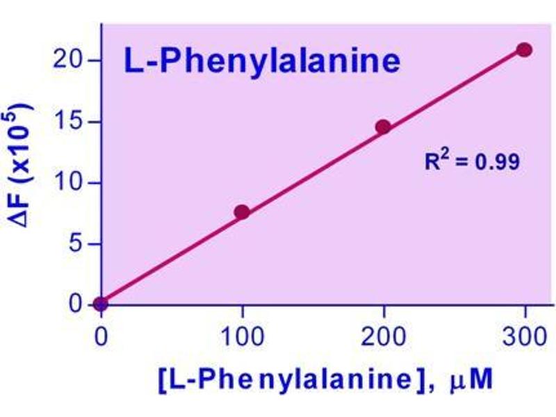 L-Phenylalanine is one of the twenty common amino acids and an important precursor for several key signal molecules such as dopamine, norepinephrine, epinephrine, and the skin pigment melanin. It is found naturally in the breast milk of mammals, and used as nutritional supplements in food and drink products. The genetic disorder phenylketonuria is the inability to metabolize phenylalanine. Individuals with this disorder are known as phenylketonurics. Individuals who cannot metabolize phenylalanine must monitor their intake of protein to control the buildup of phenylalanine. This L-Phenylalanine Assay Kit provides a convenient fluorimetric means to measure L-phenylalanine in biological samples. In the assay, L-phenylalanine is oxidized by phenylalanine dehydrogenase, producing NADH, which reduces a fluorescent dye to a highly fluorescent product. The resulting fluorescence intensity (exc/em = 530/595nm) is linear to the L-phenylalanine concentration in the sample.