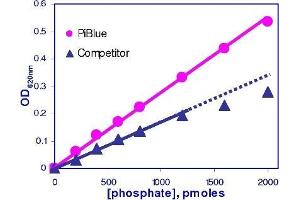 Reagent very stable. Due to our innovative formulation, no precipitation of reagent occurs. Therefore no filtration of reagent is needed prior to assays, as is often required with other commercial kits. High sensitivity and wide detection range: detection of as little of 20 pmoles of phosphate and useful range between 0.4 µM and 50 µM phosphate.