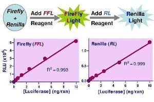 The accuracy of reporter assays can be improved by utilizing a dual reporter system. One of the reporter genes is correlated with the promoter of interest and is used to assess the effects of specific experimental conditions, while the second reporter is used as a control and serves as a baseline response. The Dual-Luciferase Reporter Gene Assay allows for the sequential measurement of the activity of two different luciferases, firefly (FFL) and Renilla (RL), in a single sample. The firefly luciferase luminescence is measured first by addition of the FFL Reagent. Next, the RL Reagent is added to the same well. The RL Reagent simultaneously quenches the firefly luciferase luminescence and initiates the Renilla luciferase reaction. The light production of both reactions can be conveniently measured on a luminometer. This bioluminescent dual reporter gene assay is extremely sensitive and is especially suitable for quantifying dual luciferase expression in recombinant cells or in cell free transcription/translation reactions. Assays can be performed in tubes, cuvettes or multi-well plates.