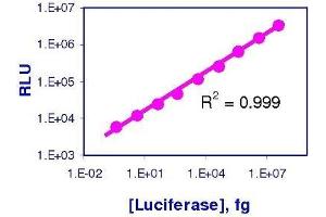 High sensitivity and wide detection range: detection of as little of 2 fg luciferase and as few as 4 cells. Plus, the emitted light is linear over seven orders of magnitude.