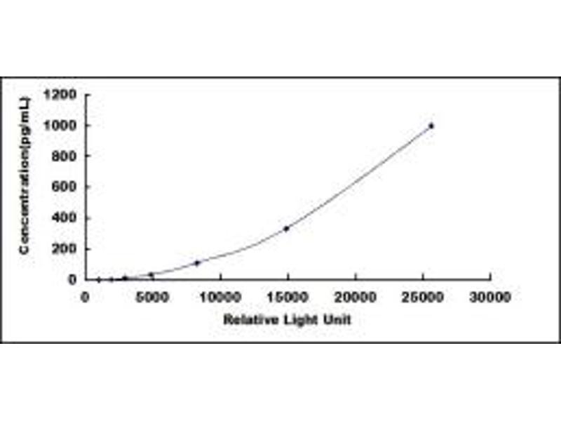 In order to make the calculation easier, we plot the RLU value of the standard (X-axis) against the known concentration of the standard (Y-axis), although concentration is indeed the independent variable while RLU value is the dependent variable. Further, in this part, in order to help the customer perform the assay more visual, we provide the customer with the raw data (not the log of data). However, plotting log of the data to construct the curve will be recommended. The RLU values of the standard curve may vary according to the conditions of assay performance (e.g. operator, pipetting technique, washing technique or temperature effects). This curve is provided for demonstration only. The customers should establish their own standard curve for each test conducted. -