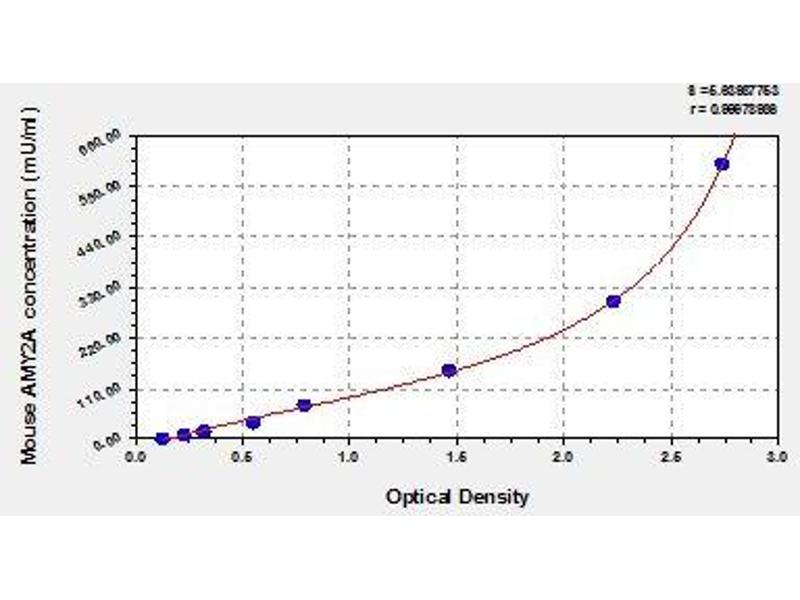 Antibody specific for AMY2A has been pre-coated onto a microplate. Standards and samples are pipetted into the wells and any AMY2A present is bound by the immobilized antibody. After removing any unbound substances, a biotin-conjugated antibody specific for AMY2A is added to the wells. After washing, avidin conjugated Horseradish Peroxidase (HRP) is added to the wells. Following a wash to remove any unbound avidin-enzyme reagent, a substrate solution is added to the wells and color develops in proportion to the amount of AMY2A bound in the initial step. The color development is stopped and the intensity of the color is measured.