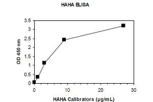 - Assay standards, controls and patient samples are directly added to wells of a microplate that is coated with highly purified human IgG. After the first incubation period, the HAHA binds to the human IgG on the wall of microtiter well and unbound proteins in each microtiter well are washed away. Then a horseradish peroxidase (HRP)-labeled human antibody is added to each microtiter well and a sandwich of well coated human IgG HAHA HRP-Conjugated human antibody is formed. The unbound HRP conjugated human antibody is removed in the subsequent washing step. For the detection of this immunocomplex, the well is then incubated with a substrate solution in a timed reaction and then measured in a spectrophotometric microplate reader. The enzymatic activity of the immunocomplex bound to HAHA on the wall of the microtiter well is directly proportional to the amount of HAHA in the sample. A standard curve is generated by plotting the absorbance versus the respective HAHA concentration for each standard on point-to-point or 4 parameter curve fit. The concentration of HAHA in test samples is determined directly from this standard curve.