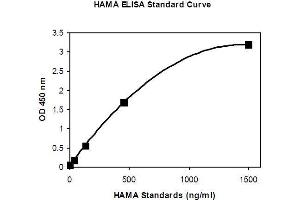 - Assay standards, controls and patient samples are directly added to wells of a microplate that is coated with murine IgG. After the first incubation period, the HAMA binds to the murine IgG on the wall of microtiter well and unbound proteins in each microtiter well are washed away. Then a horseradish peroxidase (HRP) labeled murine IgG is added to each microtiter well and a sandwich of murine IgG HAMA murine IgG is formed. The unbound HRP conjugated murine IgG is removed in the subsequent washing step. For the detection of this immunocomplex, the well is then incubated with a substrate solution in a timed reaction and then measured in a spectrophotometric microplate reader. The enzymatic activity of the immunocomplex bound to HAMA on the wall of the microtiter well is directly proportional to the amount of HAMA in the sample. A standard curve is generated by plotting the absorbance versus the respective HAMA concentration for each standard on point-to-point, cubical scales or 4 parameter curve fit. The concentration of HAMA in test samples is determined directly from this standard curve.