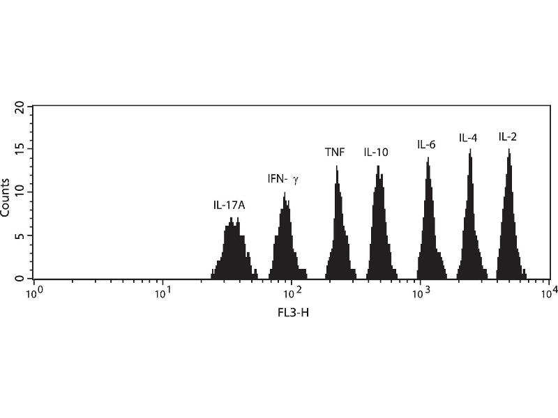 Reagents for capture and detection of IL-2, IL-4, IL-6, IL-10, TNF, IFN-gamma, and IL-17A, wash buffer, assay diluent, serum enhancement buffer, cytometer setup reagents