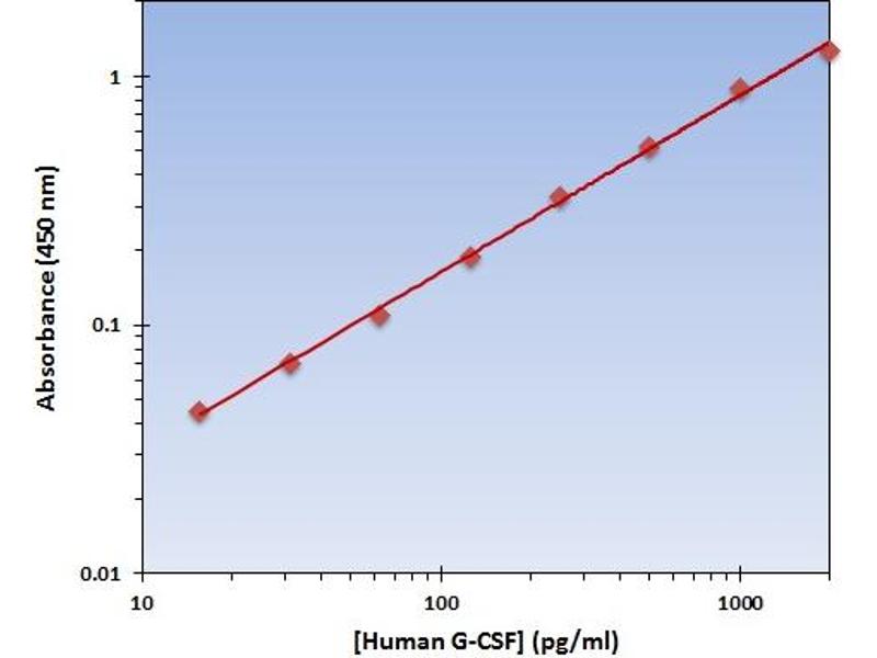 - The OmniKine? Human G-CSF ELISA Kit contains the components necessary for quantitative determination of natural or recombinant Human G-CSF concentrations within any experimental sample including cell lysates, serum and plasma. This particular immunoassay utilizes the quantitative technique of a "Sandwich" Enzyme-Linked Immunosorbent Assay (ELISA) where the target protein (antigen) is bound in a "sandwich" format by the primary capture antibodies coated to each well-bottom and the secondary detection antibodies added subsequently by the investigator. The capture antibodies coated to the bottom of each well are specific for a particular epitope on Human G-CSF while the user-added detection antibodies bind to epitopes on the captured target protein. Amid each step of the procedure, a series of wash steps must be performed to ensure the elimination of non-specific binding between proteins to other proteins or to the solid phase. After incubation and "sandwiching" of the target antigen, a peroxidase enzyme is conjugated to the constant heavy chain of the secondary antibody (either covalently or via Avidin/Streptavidin-Biotin interactions), allowing for a colorimetric reaction to ensue upon substrate addition. When the substrate TMB (3, 3', 5, 5'-Tetramethylbenzidine) is added, the reaction catalyzed by peroxidase yields a blue color that is representative of the antigen concentration. Upon sufficient color development, the reaction can be terminated through addition of Stop Solution (2 N Sulfuric Acid) where the color of the solution will turn yellow. The absorbance of each well can then be read by a spectrophotometer, allowing for generation of a standard curve and subsequent determination of protein concentration.