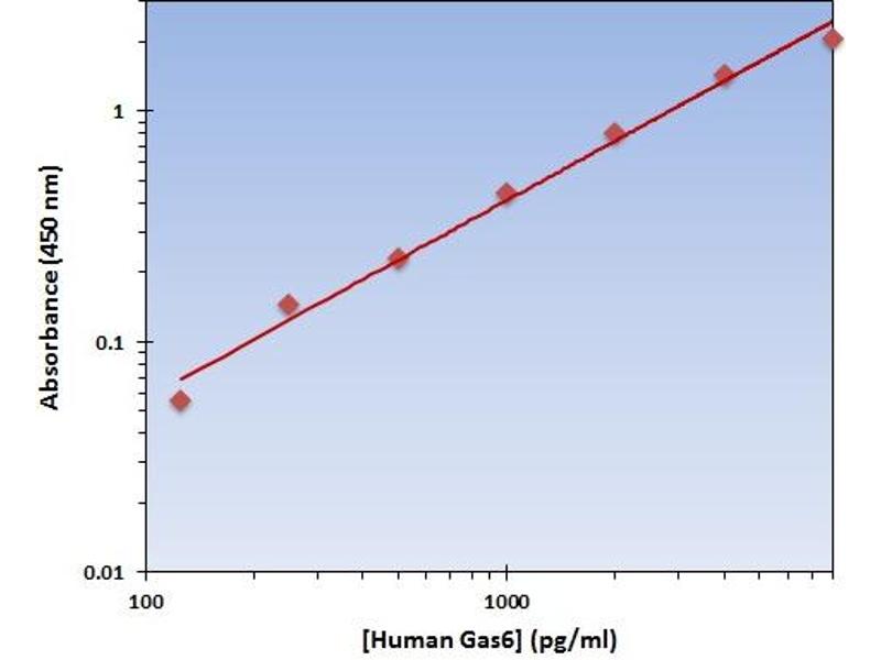 - Gas6 is a ligand for tyrosine-protein kinase receptors AXL, TYRO3 and MER, whose signaling is implicated in cell growth and survival, cell adhesion and cell migration. Gas6/AXL signaling plays a role in various processes such as endothelial cell survival during acidification by preventing apoptosis, optimal cytokine signaling during human natural killer cell development, hepatic regeneration, gonadotropin-releasing hormone neuron survival and migration, platelet activation, or regulation of thrombotic responses. Isoform 1 and isoform 2 are widely expressed. Isoform 1 is the predominant form in spleen and is proteolytically processed after secretion to yield an N-terminal 36 kDa protein and a C-terminal 50 kDa protein including the laminin G-like domains which activates AXL. Gamma-carboxyglutamate residues are formed by vitamin K dependent carboxylation. These residues are essential for the binding of calcium. Source: Entrez Gene, Swiss-Prot