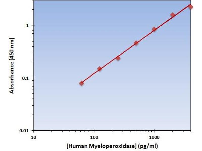 - The OmniKine? Human Myeloperoxidase ELISA Kit contains the components necessary for quantitative determination of natural or recombinant Human Myeloperoxidase concentrations within any experimental sample including cell lysates, serum and plasma. This particular immunoassay utilizes the quantitative technique of a "Sandwich" Enzyme-Linked Immunosorbent Assay (ELISA) where the target protein (antigen) is bound in a "sandwich" format by the primary capture antibodies coated to each well-bottom and the secondary detection antibodies added subsequently by the investigator. The capture antibodies coated to the bottom of each well are specific for a particular epitope on Human Myeloperoxidase while the user-added detection antibodies bind to epitopes on the captured target protein. Amid each step of the procedure, a series of wash steps must be performed to ensure the elimination of non- specific binding between proteins to other proteins or to the solid phase. After incubation and "sandwiching" of the target antigen, a peroxidase enzyme is conjugated to the constant heavy chain of the secondary antibody (either covalently or via Avidin/Streptavidin-Biotin interactions), allowing for a colorimetric reaction to ensue upon substrate addition. When the substrate TMB (3, 3', 5, 5'-Tetramethylbenzidine) is added, the reaction catalyzed by peroxidase yields a blue color that is representative of the antigen concentration. Upon sufficient color development, the reaction can be terminated through addition of Stop Solution (2 N Sulfuric Acid) where the color of the solution will turn yellow. The absorbance of each well can then be read by a spectrophotometer, allowing for generation of a standard curve and subsequent determination of protein concentration.
