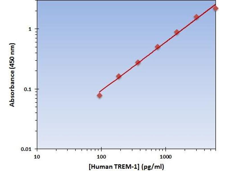 - The OmniKine? Human TREM-1 ELISA Kit contains the components necessary for quantitative determination of natural or recombinant Human TREM-1 concentrations within any experimental sample including cell lysates, serum and plasma. This particular immunoassay utilizes the quantitative technique of a "Sandwich" Enzyme-Linked Immunosorbent Assay (ELISA) where the target protein (antigen) is bound in a "sandwich" format by the primary capture antibodies coated to each well-bottom and the secondary detection antibodies added subsequently by the investigator. The capture antibodies coated to the bottom of each well are specific for a particular epitope on Human TREM-1 while the user-added detection antibodies bind to epitopes on the captured target protein. Amid each step of the procedure, a series of wash steps must be performed to ensure the elimination of non-specific binding between proteins to other proteins or to the solid phase. After incubation and "sandwiching" of the target antigen, a peroxidase enzyme is conjugated to the constant heavy chain of the secondary antibody (either covalently or via Avidin/Streptavidin-Biotin interactions), allowing for a colorimetric reaction to ensue upon substrate addition. When the substrate TMB (3, 3', 5, 5'-Tetramethylbenzidine) is added, the reaction catalyzed by peroxidase yields a blue color that is representative of the antigen concentration. Upon sufficient color development, the reaction can be terminated through addition of Stop Solution (2 N Sulfuric Acid) where the color of the solution will turn yellow. The absorbance of each well can then be read by a spectrophotometer, allowing for generation of a standard curve and subsequent determination of protein concentration.