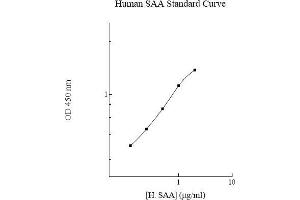 Prepare all reagents , standard solutions , and samples as instructed. Bring all reagents to room temperature before use. The assay is performed at room temperature (20-25 °C). Remove excess microplate s trips from the plate frame and return them immediately to the foil pouch with desiccants inside. Reseal the pouch securely to minimize exposure to water vapor and s tore in a vacuum desiccator. Add 50 l of Human Serum Amyloid A Standard or sample to each well. Gently tap plate to thoroughly coat the wells. Break any bubbles that may have formed. Cover wells with a sealing tape and incubate for 2 hours . Start the timer after the last addition. Wash five times with 200 l of Wash Buffer manually. Invert the plate each time and decant the contents , hi t 4-5 times on absorbent material to completely remove the liquid. If using a machine, wash six times with 300 l of Wash Buffer and then invert the plate, decanting the contents , hi t 4-5 times on absorbent material to completely remove the liquid. Add 50 l of Biotinylated Human Serum Amyloid A Antibody to each well . Gently tap plate to thoroughly coat the wells. Break any bubbles that may have formed. Cover wells with a sealing tape and incubate for 1 hour. Wash the microplate as described above . Add 50 l of SP Conjugate to each well . Gently tap plate to thoroughly coat the wells . Break any bubbles that may have formed. Cover wells with a sealing tape and incubate for 30 minutes . Turn on the microplate reader and set up the program in advance. Wash the microplate as described above . Add 50 l of Chromogen Substrate to each well . Gently tap plate to thoroughly coat the wells. Break any bubbles that may have formed. Incubate for 15 minutes or until the optimal blue color density develops. Add 50 l of Stop Solution to each well. The color will change from blue to yellow. Gently tap plate to ensure thorough mixing. Break any bubbles that may have formed. Read the absorbance on a microplate reader at a wavelength of 450 nm immediately. If wavelength correction is available, subtract readings at 570 nm from those at 450 nm to correct optical imperfections . Otherwise, read the plate at 450 nm only. Please note that some unstable black particles may be generated a t high concentration points after s topping the reaction for about 10 minutes, which will reduce the readings . 6