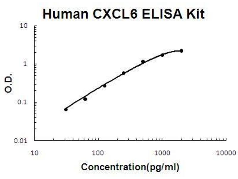 - human CXCL6 ELISA Kit was based on standard sandwich enzyme-linked immune-sorbent assay technology. A monoclonal antibody from mouse specific for CXCL6 has been precoated onto 96-well plates. Standards(E.coli, V40-N114) and test samples are added to the wells, a biotinylated detection polyclonal antibody from goat specific for CXCL6 is added subsequently and then followed by washing with PBS or TBS buffer. Avidin-Biotin-Peroxidase Complex was added and unbound conjugates were washed away with PBS or TBS buffer. HRP substrate TMB was used to visualize HRP enzymatic reaction. TMB was catalyzed by HRP to produce a blue color product that changed into yellow after adding acidic stop solution. The density of yellow is proportional to the human CXCL6 amount of sample captured in plate.