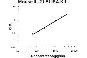 - mouse IL-21 ELISA Kit was based on standard sandwich enzyme-linked immune-sorbent assay technology. A monoclonal antibody from rat specific for IL-21 has been precoated onto 96-well plates. Standards(E.coli, P25-S146) and test samples are added to the wells, a biotinylated detection polyclonal antibody from goat specific for IL-21 is added subsequently and then followed by washing with PBS or TBS buffer. Avidin-Biotin-Peroxidase Complex was added and unbound conjugates were washed away with PBS or TBS buffer. HRP substrate TMB was used to visualize HRP enzymatic reaction. TMB was catalyzed by HRP to produce a blue color product that changed into yellow after adding acidic stop solution. The density of yellow is proportional to the mouse IL-21 amount of sample captured in plate.