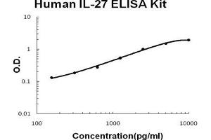 - human IL-27 ELISA Kit was based on standard sandwich enzyme-linked immune-sorbent assay technology. A monoclonal antibody from mouse specific for IL-27 has been precoated onto 96-well plates. Standards(NSO, EBI3(R21-K229)+P28(F29-P243)) and test samples are added to the wells, a biotinylated detection polyclonal antibody from goat specific for IL-27 is added subsequently and then followed by washing with PBS or TBS buffer. Avidin-Biotin-Peroxidase Complex was added and unbound conjugates were washed away with PBS or TBS buffer. HRP substrate TMB was used to visualize HRP enzymatic reaction. TMB was catalyzed by HRP to produce a blue color product that changed into yellow after adding acidic stop solution. The density of yellow is proportional to the human IL-27 amount of sample captured in plate.