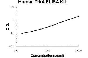 - human TrkA ELISA Kit was based on standard sandwich enzyme-linked immune-sorbent assay technology. A monoclonal antibody from mouse specific for TrkA has been precoated onto 96-well plates. Standards (NSO,A33-E407) and test samples are added to the wells, a biotinylated detection polyclonal antibody from goat specific for TrkA is added subsequently and then followed by washing with PBS or TBS buffer. Avidin-Biotin-Peroxidase Complex was added and unbound conjugates were washed away with PBS or TBS buffer. HRP substrate TMB was used to visualize HRP enzymatic reaction. TMB was catalyzed by HRP to produce a blue color product that changed into yellow after adding acidic stop solution. The density of yellow is proportional to the human TrkA amount of sample captured in plate.