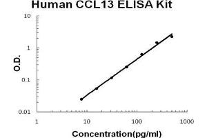 - human CCL13 ELISA Kit was based on standard sandwich enzyme-linked immune-sorbent assay technology. A monoclonal antibody from mouse specific for CCL13 has been precoated onto 96-well plates. Standards(E.coli, Q24-T98) and test samples are added to the wells, a biotinylated detection polyclonal antibody from goat specific for CCL13 is added subsequently and then followed by washing with PBS or TBS buffer. Avidin-Biotin-Peroxidase Complex was added and unbound conjugates were washed away with PBS or TBS buffer. HRP substrate TMB was used to visualize HRP enzymatic reaction. TMB was catalyzed by HRP to produce a blue color product that changed into yellow after adding acidic stop solution. The density of yellow is proportional to the human CCL13 amount of sample captured in plate.