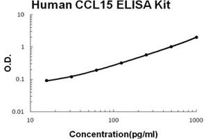 - human CCL15 ELISA Kit was based on standard sandwich enzyme-linked immune-sorbent assay technology. A monoclonal antibody from mouse specific for CCL15 has been precoated onto 96-well plates. Standards(E.coli, Q22-I113) and test samples are added to the wells, a biotinylated detection polyclonal antibody from goat specific for CCL15 is added subsequently and then followed by washing with PBS or TBS buffer. Avidin-Biotin-Peroxidase Complex was added and unbound conjugates were washed away with PBS or TBS buffer. HRP substrate TMB was used to visualize HRP enzymatic reaction. TMB was catalyzed by HRP to produce a blue color product that changed into yellow after adding acidic stop solution. The density of yellow is proportional to the human CCL15 amount of sample captured in plate.