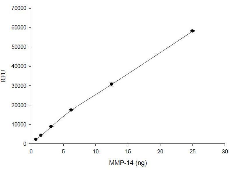 - SensoLyte® 520 MMP-14 Assay Kit uses a 5-FAM (fluorophore) and QXL™520 (quencher) labeled FRET peptide substrates for continuous measurement of the enzyme activities. In an intact FRET peptide, the fluorescence of 5-FAM is quenched by QXL™ 520. Upon the cleavage of the FRET peptide by MMP-14, the fluorescence of 5-FAM is recovered, and can be continuously monitored at excitation/emission = 490 nm/520 nm. With superior fluorescence quantum yield and longer emission wavelength, 5-FAM/QXL™520 based FRET peptide is less interfered by the autofluorescence of test compounds and cellular components and provides better assay sensitivity.