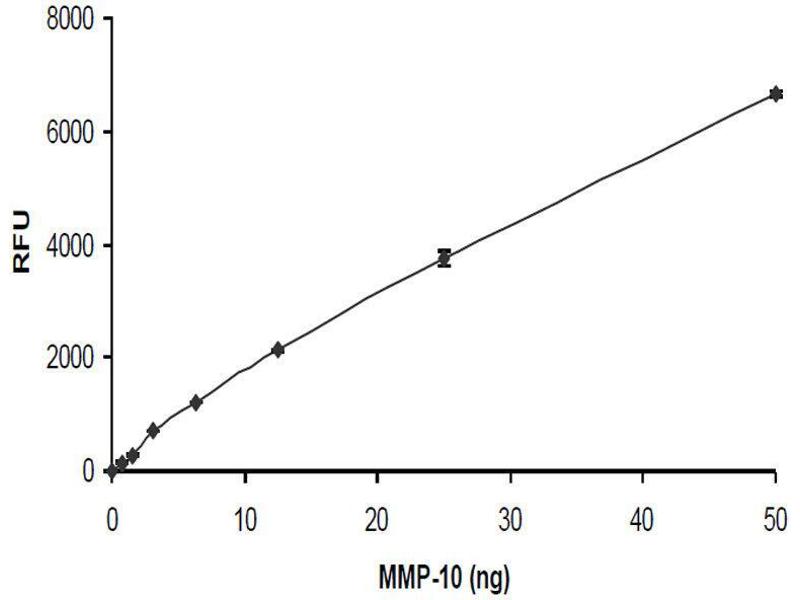 - SensoLyte® 520 MMP-10 Assay Kit uses a 5-FAM (fluorophore) and QXL™520 (quencher) labeled FRET peptide substrates for continuous measurement of the enzyme activities. In an intact FRET peptide, the fluorescence of 5-FAM is quenched by QXL™ 520. Upon the cleavage of the FRET peptide by MMP-10, the fluorescence of 5-FAM is recovered, and can be continuously monitored at excitation/emission = 490 nm/520 nm. With superior fluorescence quantum yield and longer emission wavelength, 5-FAM/QXL™520 based FRET peptide is less interfered by the autofluorescence of test compounds and cellular components and provides better assay sensitivity.
