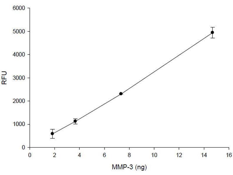 - SensoLyte® 520 MMP-3 Assay Kit uses a 5-FAM (fluorophore) and QXL520™ (quencher) labeled FRET peptide substrates for continuous measurement of the enzyme activities. This substrate showed excellent specificity to MMP-3 with minimal cross-reaction with MMP-1, 2, 7, 8, 9, 13 and 14. In an intact FRET peptide, the fluorescence of 5-FAM is quenched by QXL520™. Upon the cleavage of the FRET peptide by MMP-3, the fluorescence of 5-FAM is recovered, and can be continuously monitored at excitation/emission = 490 nm/520 nm. With superior fluorescence quantum yield and longer emission wavelength, 5-FAM/QXL520™ based FRET peptide is less interfered by the autofluorescence of test compounds and cellular components and provides better assay sensitivity.