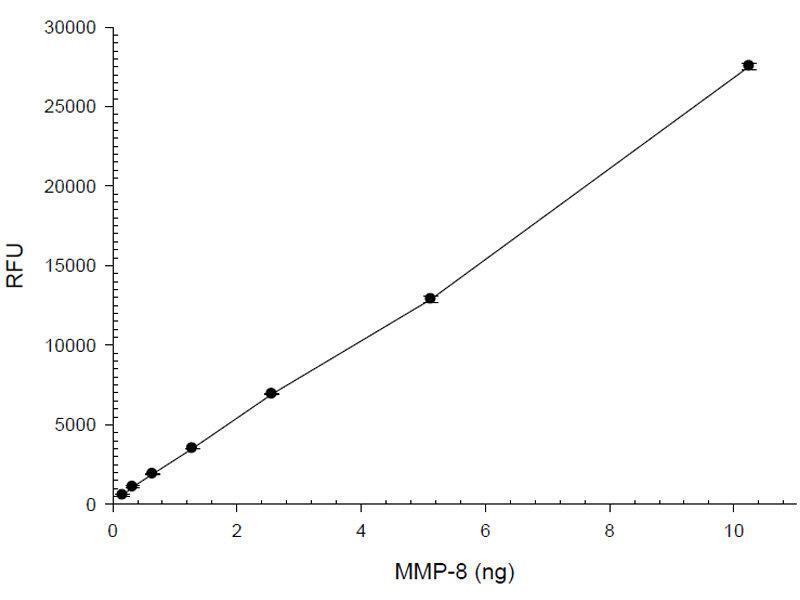 - SensoLyte® 520 MMP-8 Assay Kit uses a 5-FAM (fluorophore) and QXL520™ (quencher) labeled FRET peptide substrates for continuous measurement of the enzyme activities. In an intact FRET peptide, the fluorescence of 5-FAM is quenched by QXL520™. Upon the cleavage of the FRET peptide by MMP-8, the fluorescence of 5-FAM is recovered, and can be continuously monitored at excitation/emission = 490 nm/520 nm. With superior fluorescence quantum yield and longer emission wavelength, 5-FAM/QXL520™ based FRET peptide is less interfered by the autofluorescence of test compounds and cellular components and provides better assay sensitivity.