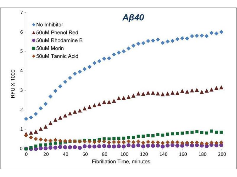 The SensoLyte® ThT Abeta Aggregation kit provides a convenient antd standard method to measure Abeta Aggregation using Thioflavin T dye. Abeta40 peptide is pretreated to ensure it is in a monomeric state. An optimized fibrillation buffer is included with the kit, and two known inhibitors are supplied as controls. The assay is based on the property of ThT dye in which fluorescence (Ex/Em=440/484nm) is increased when bound to aggregates of Abeta peptides.
