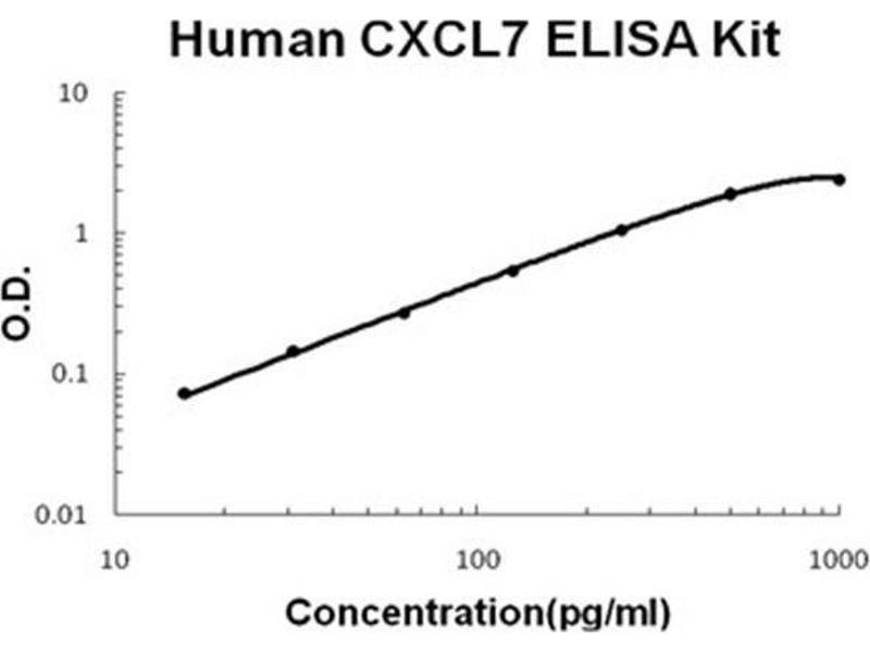 - human CXCL7 ELISA Kit was based on standard sandwich enzyme-linked immune-sorbent assay technology. A monoclonal antibody from mouse specific for CXCL7 has been precoated onto 96-well plates. Standards(E.coli, A59-D128) and test samples are added to the wells, a biotinylated detection polyclonal antibody from goat specific for CXCL7 is added subsequently and then followed by washing with PBS or TBS buffer. Avidin-Biotin-Peroxidase Complex was added and unbound conjugates were washed away with PBS or TBS buffer. HRP substrate TMB was used to visualize HRP enzymatic reaction. TMB was catalyzed by HRP to produce a blue color product that changed into yellow after adding acidic stop solution. The density of yellow is proportional to the human CXCL7 amount of sample captured in plate.