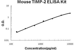 - mouse TIMP-2 ELISA Kit was based on standard sandwich enzyme-linked immune-sorbent assay technology. A monoclonal antibody from rat specific for TIMP-2 has been precoated onto 96-well plates. Standards(NSO, C27-P220) and test samples are added to the wells, a biotinylated detection polyclonal antibody from goat specific for TIMP-2 is added subsequently and then followed by washing with PBS or TBS buffer. Avidin-Biotin-Peroxidase Complex was added and unbound conjugates were washed away with PBS or TBS buffer. HRP substrate TMB was used to visualize HRP enzymatic reaction. TMB was catalyzed by HRP to produce a blue color product that changed into yellow after adding acidic stop solution. The density of yellow is proportional to the mouse TIMP-2 amount of sample captured in plate.