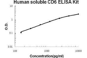 - human CD6 ELISA Kit was based on standard sandwich enzyme-linked immune-sorbent assay technology. A monoclonal antibody from mouse specific for CD6 has been precoated onto 96-well plates. Standards(NSO, H18-E398) and test samples are added to the wells, a biotinylated detection polyclonal antibody from goat specific for CD6 is added subsequently and then followed by washing with PBS or TBS buffer. Avidin-Biotin-Peroxidase Complex was added and unbound conjugates were washed away with PBS or TBS buffer. HRP substrate TMB was used to visualize HRP enzymatic reaction. TMB was catalyzed by HRP to produce a blue color product that changed into yellow after adding acidic stop solution. The density of yellow is proportional to the human CD6 amount of sample captured in plate.