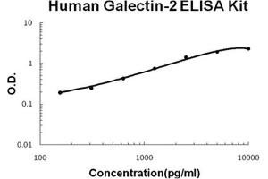 - human Galectin-2 ELISA Kit was based on standard sandwich enzyme-linked immune-sorbent assay technology. A monoclonal antibody from mouse specific for Galectin-2 has been precoated onto 96-well plates. Standards(E.coli, M1-E132) and test samples are added to the wells, a biotinylated detection polyclonal antibody from goat specific for Galectin-2 is added subsequently and then followed by washing with PBS or TBS buffer. Avidin-Biotin-Peroxidase Complex was added and unbound conjugates were washed away with PBS or TBS buffer. HRP substrate TMB was used to visualize HRP enzymatic reaction. TMB was catalyzed by HRP to produce a blue color product that changed into yellow after adding acidic stop solution. The density of yellow is proportional to the human Galectin-2 amount of sample captured in plate.