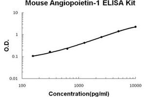- mouse Angiopoietin-1 ELISA Kit was based on standard sandwich enzyme-linked immune-sorbent assay technology. A monoclonal antibody from rat specific for Angiopoietin-1 has been precoated onto 96-well plates. Standards(NSO, H16-F497) and test samples are added to the wells, a biotinylated detection polyclonal antibody from goat specific for Angiopoietin-1 is added subsequently and then followed by washing with PBS or TBS buffer. Avidin-Biotin-Peroxidase Complex was added and unbound conjugates were washed away with PBS or TBS buffer. HRP substrate TMB was used to visualize HRP enzymatic reaction. TMB was catalyzed by HRP to produce a blue color product that changed into yellow after adding acidic stop solution. The density of yellow is proportional to the mouse Angiopoietin-1 amount of sample captured in plate.