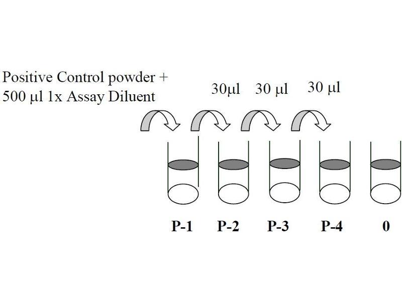 3. Preparation of Positive Control: Briefly spin the Positive Control vial of Item K. Add 500 µL 1x Assay Diluent (Item E, Assay Phospho-Mek1 (Ser217/221) and pan Mek1 ELISA Kit Protocol 6 Diluent should be diluted 5-fold with deionized or distilled water before use) into Item K vial to prepare a Positive Control (P-1) Solution (See i. Positive Control of part IX.for a typical result in page 9). Dissolve the powder thoroughly by a gentle mix (it can be removed by centrifuge if any precipitate in the solution is found). Pipette 270 µL 1x Assay Diluent into each tube. Use the Positive Control (1) to produce a dilution series (shown below). Mix each tube thoroughly before the next transfer. 1x Assay Diluent serves as the background.