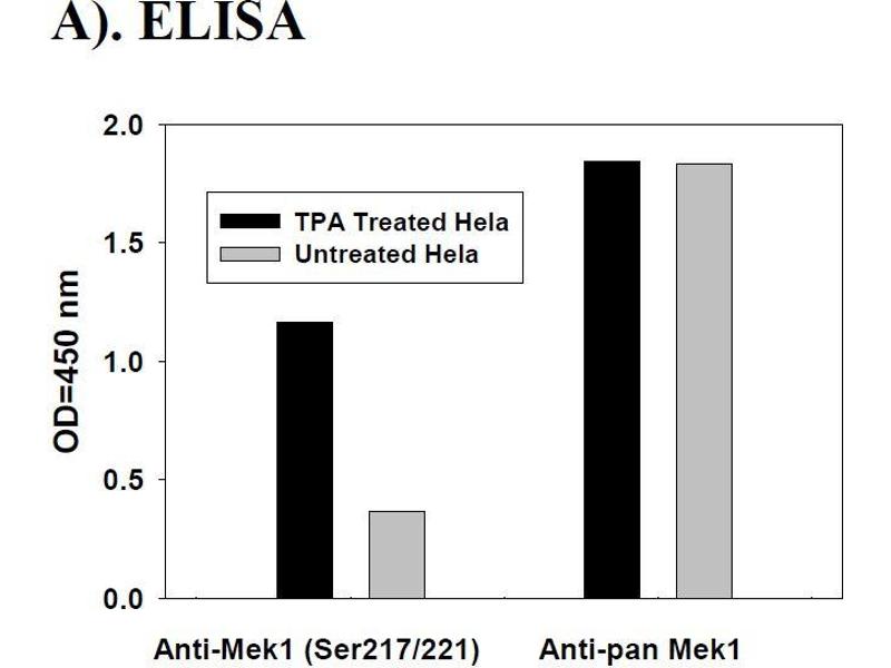 - Human/Mouse/Rat Phospho-MEK1 (S217/S221) ELISA Kit. This assay semi-quantitatively measures phophorylated Mek (Ser217/S221) in lysate samples.