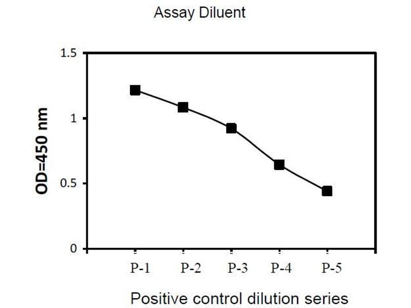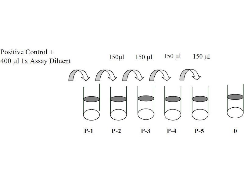 3. Preparation of Positive Control: Briefly spin the Positive Control vial of Item K. Add 400 µL 1x Assay Diluent (Item E, Assay Diluent should be diluted 5-fold with deionized or distilled water before use) into Item K vial to prepare P-1 (See i. Positive control of part IX.for a typical result). Dissolve the powder thoroughly by a gentle mix. Pipette 300 µL 1x Assay Diluent into each tube. Transfer 150 µL prepared P-1 into a tube with 300 µL 1x Asaay Diluent to produce a dilution series (shown below). Mix each tube thoroughly before the next transfer. 1x Assay Diluent serves as the background. Phospho-PYK2 ELISA 6