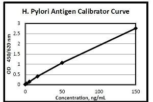 3. The calibrator curve is generated by the corrected absorbance of all calibrator levels on the ordinate against the calibrator concentration on the abscissa using point-to-point or log-log paper. Appropriate computer assisted data reduction programs may also be used for the calculation of results. The H. Pylori concentrations for the unknown samples are read directly from the calibrator curve using their respective corrected absorbance