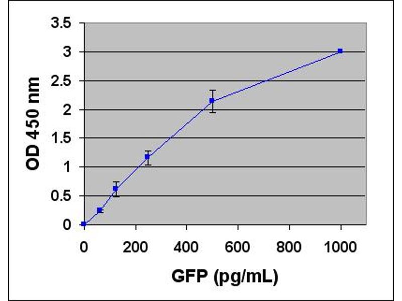 - GFP ELISA Kit is an enzyme immunoassay developed for detection and quantitation of GFP or GFP fusion protein in cell or tissue samples. The quantity of GFP or its variants (including BFP, CFP and YFP) in an unknown sample is determined by comparing its absorbance with that of a known recombinant GFP standard curve. The kit has detection sensitivity limit of 30 pg/mL GFP. The kit also provides an efficient system for rapid quantitation of GFP lentivirus titer for both viral supernatant and purified virus. Each kit provides sufficient reagents to perform up to 96 assays including standard curve and GFP samples.