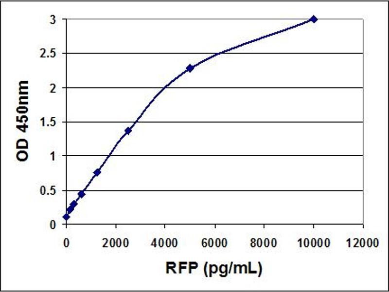 - RFP ELISA Kit is an enzyme immunoassay developed for detection and quantitation of RFP or RFP fusion protein in cell or tissue samples. The quantity of RFP or its variants (including TagRFP, TurboRFP, DsRed, tdTomato, mCherry, mKate, mRuby, mBanana, mOrange, mPlum, and mStrawberry) in an unknown sample is determined by comparing its absorbance with that of a known recombinant RFP standard curve. The kit has detection sensitivity limit of 150 pg/mL RFP. The kit also provides an efficient system for rapid quantitation of RFP lentivirus titer for both viral supernatant and purified virus. Each kit provides sufficient reagents to perform up to 96 assays including standard curve and RFP samples.