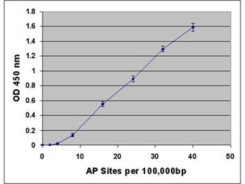 - The OxiSelect™ Oxidative DNA Damage Quantitation Kit (AP sites) uses an Aldehyde Reactive Probe (ARP) to react specifically with an aldehyde group on the open ring form of AP sites. This allows for the AP sites to be tagged with biotin which is later detected with Streptavidin-Enzyme conjugate. The quantity of AP sites in unknown DNA sample is determined by comparing its absorbance with a standard curve generated from the provided DNA standard containing predetermined AP sites. The kit has a detection sensitivity range of 4 to 40 AP sites per 1 x 105 bp. Each kit provides sufficient reagents to perform up to 10 assays, including standard curve and unknown samples.