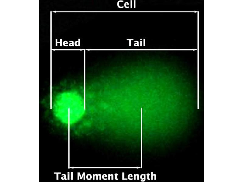 The DNA damage is quantified by measuring the displacement between the genetic material of the nucleus ('comet head') and the resulting 'tail'. Tail Moment and Tail DNA% are the two most common parameters to analyze Comet assay results. At least 50 -100 cells should be analyzed per sample. The Tail Moment has been suggested to be an appropriate index of induced DNA damage in considering both the migration of the genetic material as well as the relative amount of DNA in the tail. Tail DNA% = 100 x Tail DNA Intensity/Cell DNA Intensity Tail Moment can be measured using one of the following methods: (a) Olive Tail Moment = Tail DNA% x Tail Moment Length (b) Extent Tail Moment = Tail DNA% x Length of Tail (see Figure 3) A number of Comet Assay analysis software programs are commercially available, such as Comet Assay IV (Perceptive Instruments) and CASPlab. Tail Moment Length is measured from the center of the head to the center of the tail (see Figure 3) Figure 3: Typical Damaged DNA in Comet Assay. 8
