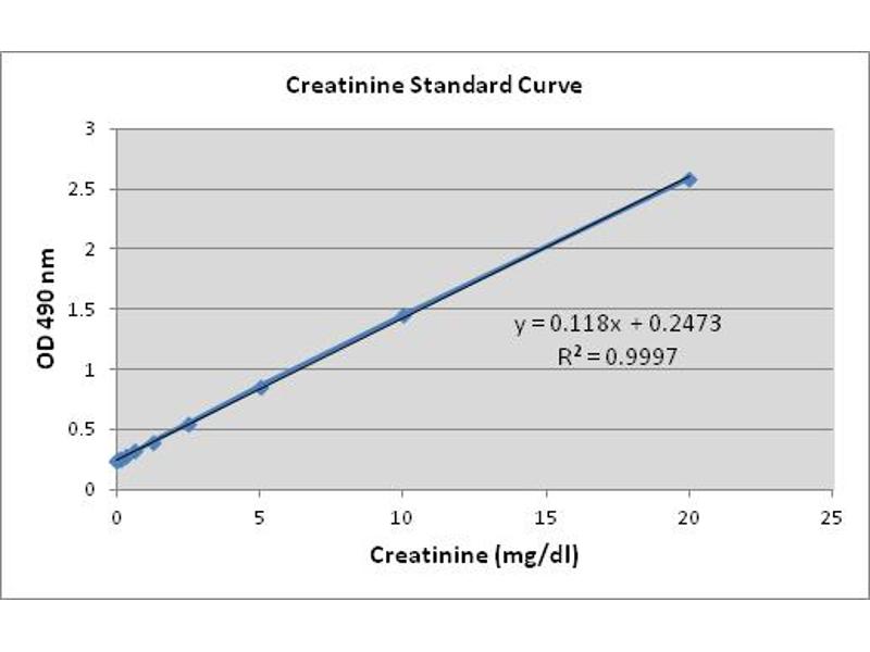 - Samples are compared to a known concentration of creatinine standard within a 96-well microtiter plate format. Samples and standards are incubated for 30 minutes with a reaction reagent which changes color from yellow to bright orange upon reacting with creatinine, forming the creatinine-picrate complex. The plate is read with a standard 96-well spectrophotometric microplate reader at 490 nm . Higher OD values correlate with high creatinine concentrations. Sample creatinine concentrations are determined by comparison with the known creatinine standards. Interference from non-specific chromogens can be measured by adding the creatinine quencher, which destroys the creatinine-picrate complex, thus eliminating all absorbance from creatinine. The remaining absorbance is from the non-specific chromogens, which can be subtracted from the overall values.