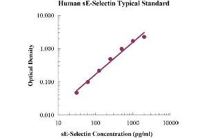 Average the duplicate optical density readings for each standards and sample, then subtract the average optical density value of the zero standard. Standard Concentration as horizontal axis, optical density (OD) Value as the vertical axis, regressing the data and create a standard curve using computer software. The data may be linearized by plotting the log of the sE-Selectin concentrations versus the log of the OD and the best fit line can be determined by regression analysis. This procedure will produce an adequate but less precise fit of the data. Note: The finally concentration of top standard is 6000 pg/mL. If instruction in this protocol have been followed samples have been diluted by 1:1 ratio (50 μL sample + 50 μL Assay Buffer), the concentration read from the standard curve must be multiplied by the dilution factor (x2). If serum/plasma samples have been diluted following the instruction, the final dilution factor is 10.