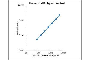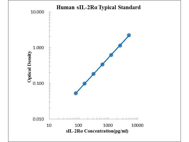 Average the duplicate optical density readings for each standards and sample, then subtract the average optical density value of the zero standard. Standard Concentration as horizontal axis, optical density (OD) Value as the vertical axis, regressing the data and create a standard curve using computer software. The data may be linearized by plotting the log of the sIL-2Rα concentrations versus the log of the OD and the best fit line can be determined by regression analysis. This procedure will produce an adequate but less precise fit of the data. Note: The finally concentration of top standard is 5000 pg/mL. If instruction in this protocol have been followed samples have been diluted by 1:1 ratio (50 μL sample + 50 μL Assay Buffer), the concentration read from the standard curve must be multiplied by the dilution factor (x2). If samples have been diluted, the concentration read from the standard curve must be multiplied by the dilution factor.