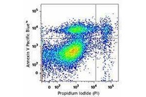 - Pacific Blue™ Annexin V Apoptosis Detection Kit with PI has been specifically designed for the identification of apoptotic and necrotic cells. Annexin V (or Annexin A5) is a member of the annexin family of intracellular proteins that binds to phosphatidylserine (PS) in a calcium-dependent manner. PS is normally only found on the intracellular leaflet of the plasma membrane in healthy cells, but during early apoptosis, membrane asymmetry is lost and PS translocates to the external leaflet. Fluorochrome-labeled Annexin V can then be used to specifically target and identify apoptotic cells. Annexin V Binding Buffer is recommended for use with Annexin V staining. Annexin V binding alone cannot differentiate between apoptotic and necrotic cells. To help distinguish between the necrotic and apoptotic cells we recommend use of our Propidium Iodide Solution (PI). Early apoptotic cells will exclude PI, while late stage apoptotic cells and necrotic cells will stain positively, due to the passage of these dyes into the nucleus where they bind to DNA. Propidium iodide is a fluorescent dye that binds to DNA. When excited by 488 nm laser light, it can be detected with in the PE/Texas Red® channel with a bandpass filter 610/10. It is commonly used in evaluation of cell viability or DNA content in cell cycle analysis by flow cytometry.