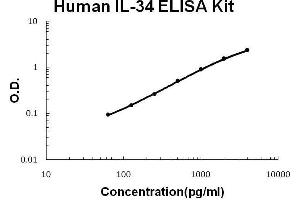 - human IL-34 ELISA Kit was based on standard sandwich enzyme-linked immune-sorbent assay technology. A monoclonal antibody from mouse specific for IL-34 has been precoated onto 96-well plates. Standards(E.coli, N21-P242) and test samples are added to the wells, a biotinylated detection polyclonal antibody from goat specific for IL-34 is added subsequently and then followed by washing with PBS or TBS buffer. Avidin-Biotin-Peroxidase Complex was added and unbound conjugates were washed away with PBS or TBS buffer. HRP substrate TMB was used to visualize HRP enzymatic reaction. TMB was catalyzed by HRP to produce a blue color product that changed into yellow after adding acidic stop solution. The density of yellow is proportional to the human IL-34 amount of sample captured in plate.