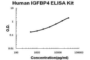 - human IGFBP4 ELISA Kit was based on standard sandwich enzyme-linked immune-sorbent assay technology. A monoclonal antibody from mouse specific for IGFBP4 has been precoated onto 96-well plates. Standards (NSO, D22-E258) and test samples are added to the wells, a biotinylated detection polyclonal antibody from goat specific for IGFBP4 is added subsequently and then followed by washing with PBS or TBS buffer. Avidin-Biotin-Peroxidase Complex was added and unbound conjugates were washed away with PBS or TBS buffer. HRP substrate TMB was used to visualize HRP enzymatic reaction. TMB was catalyzed by HRP to produce a blue color product that changed into yellow after adding acidic stop solution. The density of yellow is proportional to the human IGFBP4 amount of sample captured in plate.
